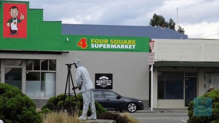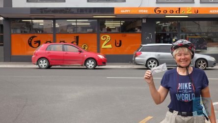 In Ranfurly lag nach 3 Tagen der nächste Supermarkt auf unserer Strecke. Mit Vorfreude auf die Schätze, die wir gleich einkaufen wollten, suchte Ute nach ihrer Brille, die noch kurz zuvor um ihren Hals hing. Sie war weg. Durch eigene Dussligkeit! Keine 100m vor dem Laden hatte Ute an einer Kreuzung die Kapuze vom Regencape abgesetzt – schon in Vorbereitung auf den bevorstehenden Einkauf. Dabei fiel die Brille unbemerkt auf die Fahrbahn. Es kam was kommen musste. In der kurzen Zeit zwischen unserer Weiterfahrt zum Laden und der Rückkehr zur Kreuzung war ein Auto genau über die Brille gerauscht und hatte sie platt gemacht. An der teuren Gleitsicht-Brille war nun nichts mehr zu retten. Mist!