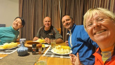 Für die nächste Nacht kamen noch zwei weitere Bewohner dazu, nämlich die beiden Radfahrer Linsey und Murray. Wir hatten beide schon mehrfach auf der Strecke getroffen und uns gegenseitig überholt. Nun war für sie heute hier Schluss. Ihr Gepäck, dass ihnen immer von Übernachtung zu Übernachtung transportiert wurde, fanden sie übrigens auf der anderen Straßenseite vor einem verschlossenen und verlassenen Hotel herrenlos stehen. Aber in diesem 39-Seelen-Dorf kommt nichts weg, versicherte der Ladenbesitzer.