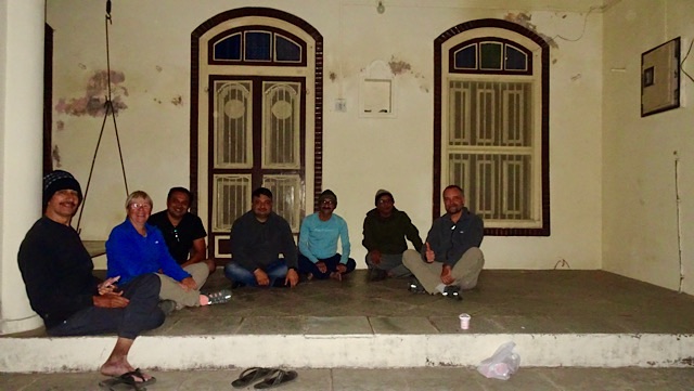 So was muss man mal erlebt haben. Eine Kreuzung weiter stand ein Wohnhaus und auf dessen Treppenstufen saßen 6 Freunde von Rushi, darunter 2 Cousins von ihm. Und diese weisen Männer von Kachholi treffen sich hier jeden Abend für etwa 2 Stunden, um die neuesten Neuigkeiten untereinander auszutauschen. Dabei wird auch viel über das große Weltgeschehen philosophiert. Ein Cousin von Rushi und recht aktiver Part dieser Runde sprach sehr gut Englisch. Dadurch bekamen wir ziemlich viel mit. Unter anderem haben wir erfahren, dass die Hindus nicht den Druck haben, besonders viele Kinder zu bekommen. Alle in der Runde hatten ein oder zwei Kinder, bis auf einen Mann. Der bekam das zweite Kind gleich in doppelter Ausführung. Die beiden Zwillingsschwestern studieren gerade in Frankfurt am Main. Der stolze Papa hat natürlich gleich eine Telefonverbindung hergestellt und wir haben mit den Mädchen ein paar Worte gewechselt.