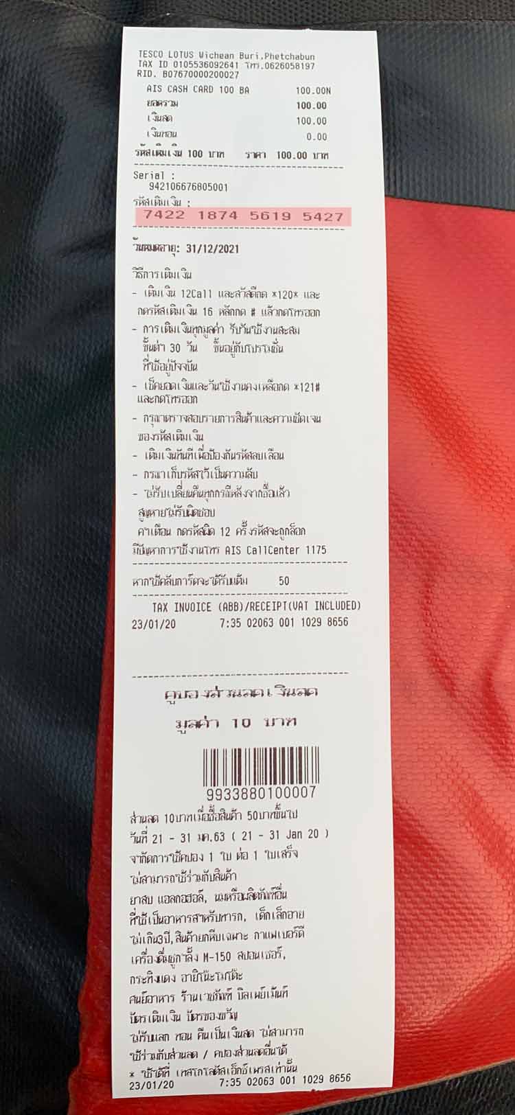 Du bekommst einen Kassenbon mit einem 16stelligen Guthabencode, den du dann über die App, die Webseite oder mittels Kurzwahl deinem Telefon-Konto gutschreibst. Bei uns ist nach der Eingabe des Guthabencodes die AIS App abgestürzt. Das ist vielleicht nur ein temporäres Problem.